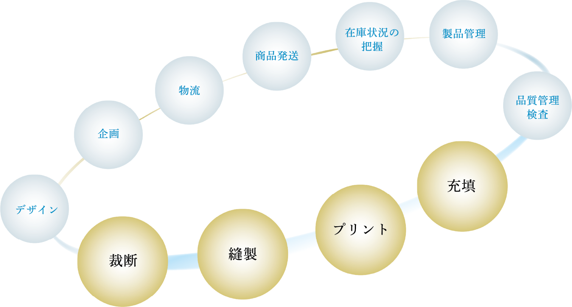 時代とともに多様化するニーズに応えるべく、近年では縫製やプリントの領域にも対応を拡大し、企画から製造までをワンストップで担える体制を国内で整えております。